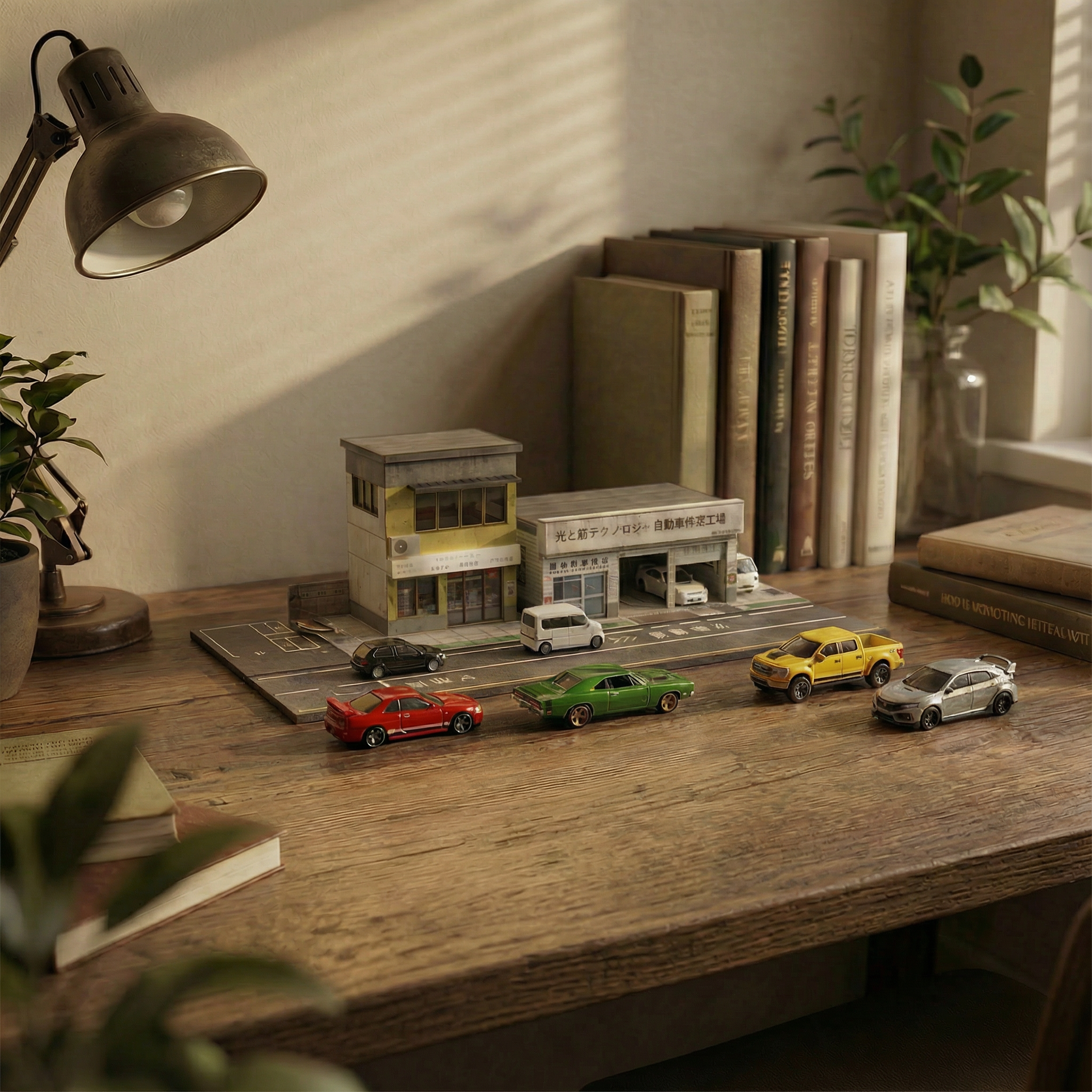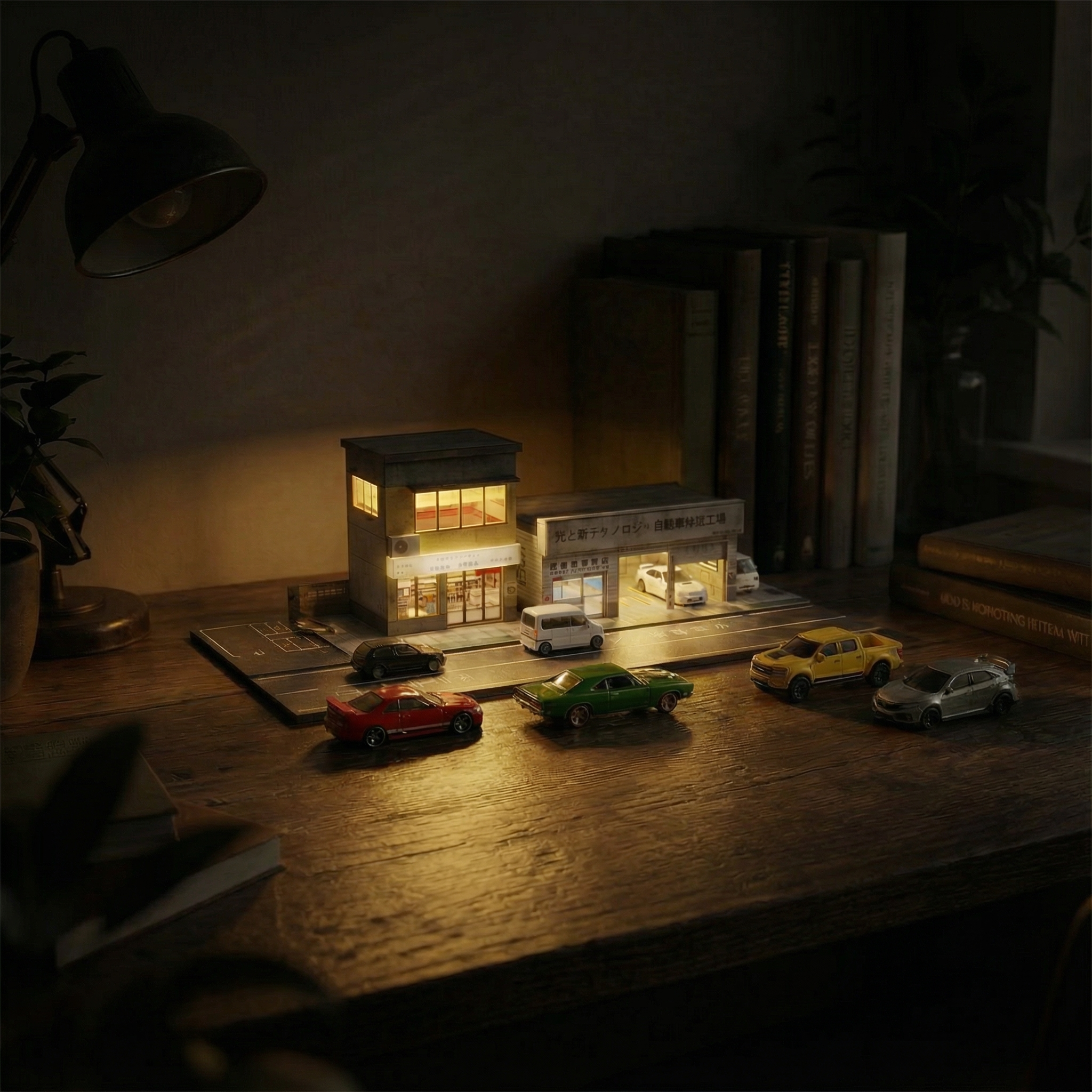 This intricate 1/64 scale model captures the charm of a traditional Japanese corner store and repair shop. With detailed workshop full of tools and vehicles, it’s a nostalgic tribute to Japan’s local streets, perfect for collectors and enthusiasts.